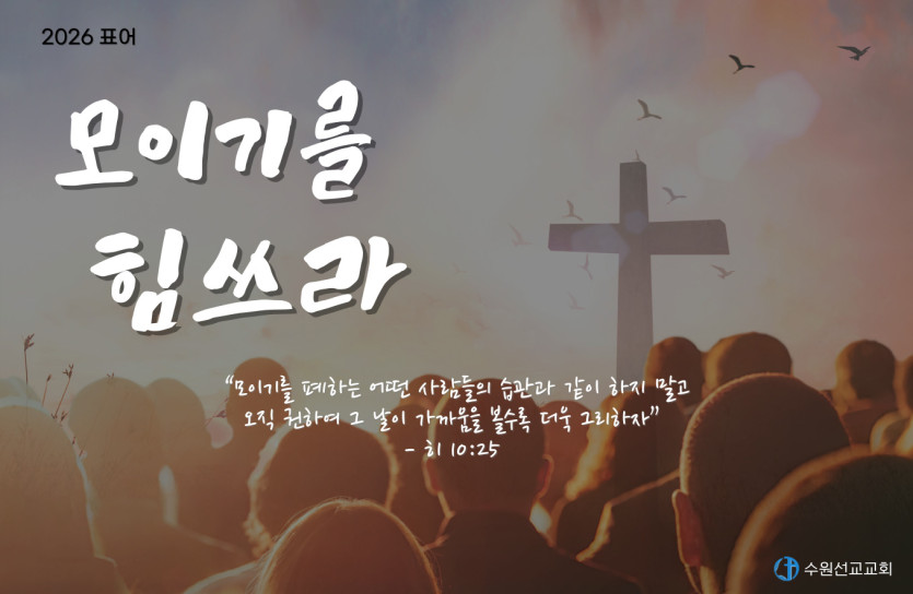 2026년 표어 페이지 정보 작성자 정종연 댓글 0건 조회 6회 작성일 26-01-05 22:42 목록 본문 모이기를 힘쓰라 다음글2025년 수원선교교회 성탄예배, 경배프로그램에 당신을 초대합니다 ! 25.12.07 댓글 0 댓글목록 등록된 댓글이 없습니다.